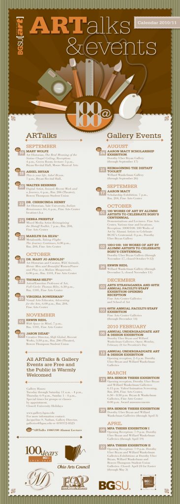 Gestaltung eines Faltflyers mit passendem Kuvert für die Art of School der Bowling Green State University, Ohio/USA. Der Veranstaltungsflyer „ARTalks & events“ informiert über Vorträge und Events, die im Laufe eines Semesters an der Universität stattfinden.