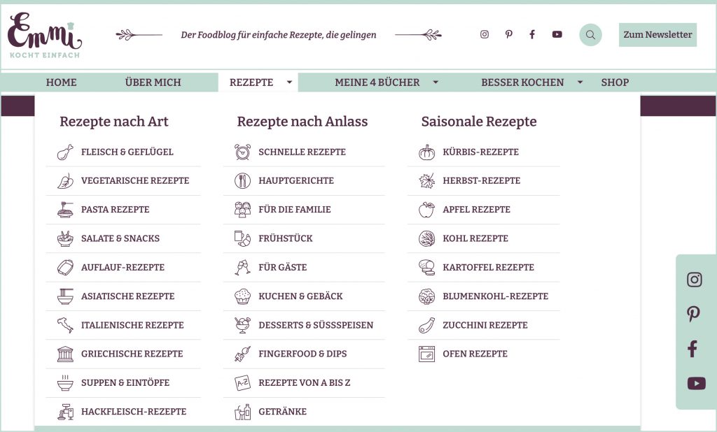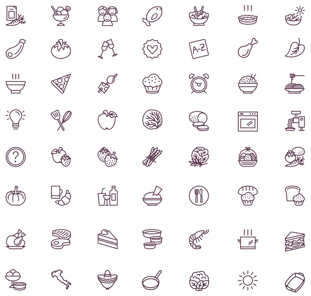 Erstellung einer Piktogramm-Serie für den Kochblog „Emmi kocht einfach“. Auf der Website steht neben jeder Rezept-Rubrik ein entsprechendes Piktogramm – zu einem zur optischen Aufkockerung, aber vor allem soll es dem Leser helfen, sich schnell zurecht zu finden. Da die Piktogramme auf der Website sehr klein erscheinen, war es die Aufgabe, ein reduziertes Zeichen mit wenig Strichen zu entwerfen, welches dennoch sofort erkennbar ist.