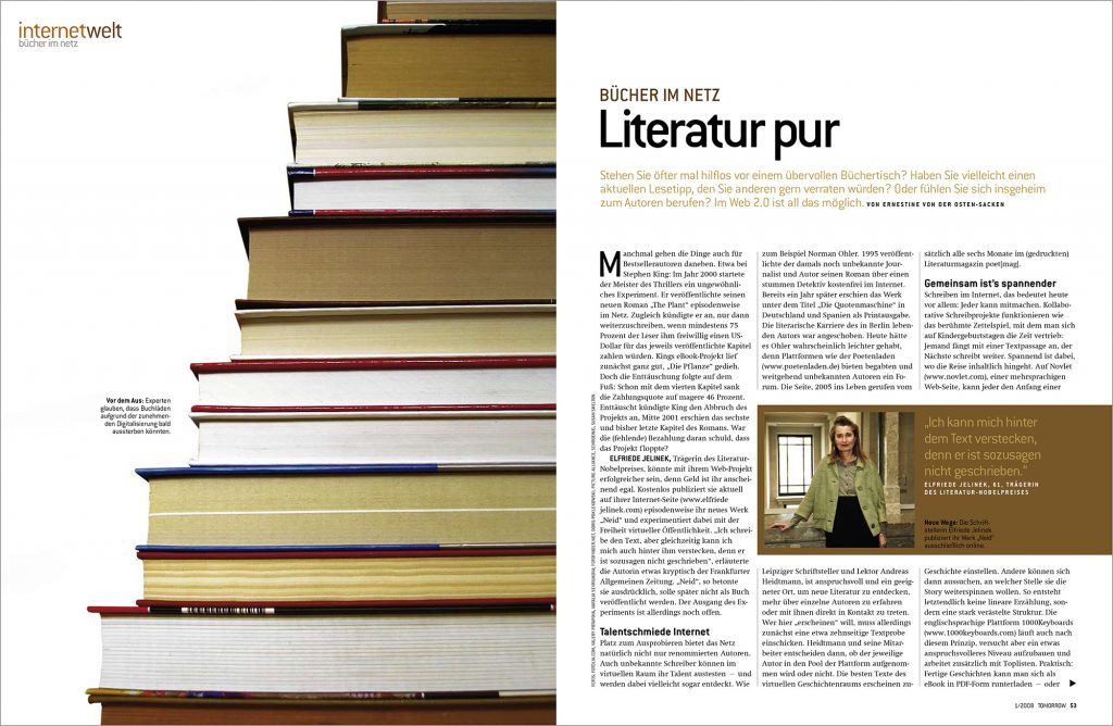 Während meiner Anstellung als Artdirektorin beim Lifestyle-Magazin „Tomorrow“, war ich u.a. für das optische Erscheinungsbild, Layout und die Erstellung von Illustrationen zuständig. Hier eine kleine Auswahl an veröffentlichten Ausgaben und Artikeln.