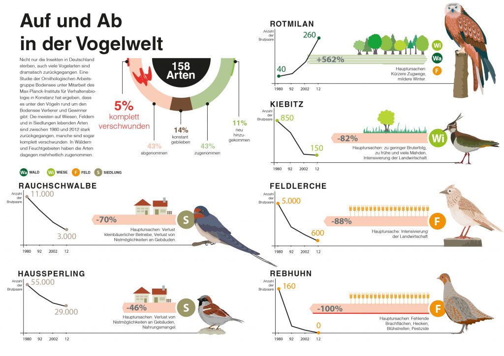 Vogel-Illustrationen für eine Infografik über den Bestand bestimmter Vogelarten. Die Illustrationen habe ich digital als Vektorgrafik erstellt.