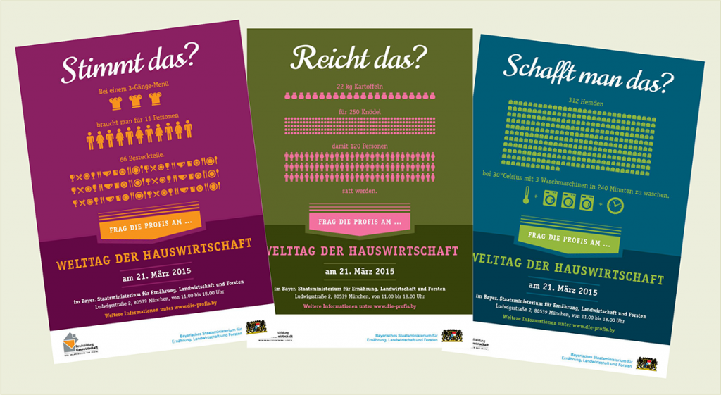 Im Rahmen der Entwicklung einer Imagekampagne zum „Welttag der Hauswirtschaft“ habe ich diese Posterserie inklusive der Infografiken gestaltet. Hierbei lag der Fokus darauf, interessante Zahlen und Fakten optisch ansprechend darzustellen, um so Neugier zu wecken. Text & Konzeption Anette Hrubesch
